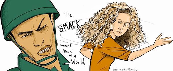 International media have been drawn to Nabi Saleh and its unofficial “first family” since at least 2011 and eleven year old Ahed’s debut, shaking he tiny fist at a tall, bemused, confused infantryman. In August 2015, she hit the big time when she and her female relatives prevented a masked and armed soldier from arresting her little brother. That soldiers should arrest a wee lad with his arm in a caste might see, slightly incredulous to outsiders. But it was the scrum that ensued, a melee of flying fists, writhing bodies, shouts, screams and tears, as women and girls piled into the unfortunate soldier, recorded by convenient posse of professional photographers and handy smartphones, that sent images ricocheting around the world. And then, in December, there was the slap that reverberated across the globe. One thing for sure: this girl has really been trying hard to get herself arrested.
