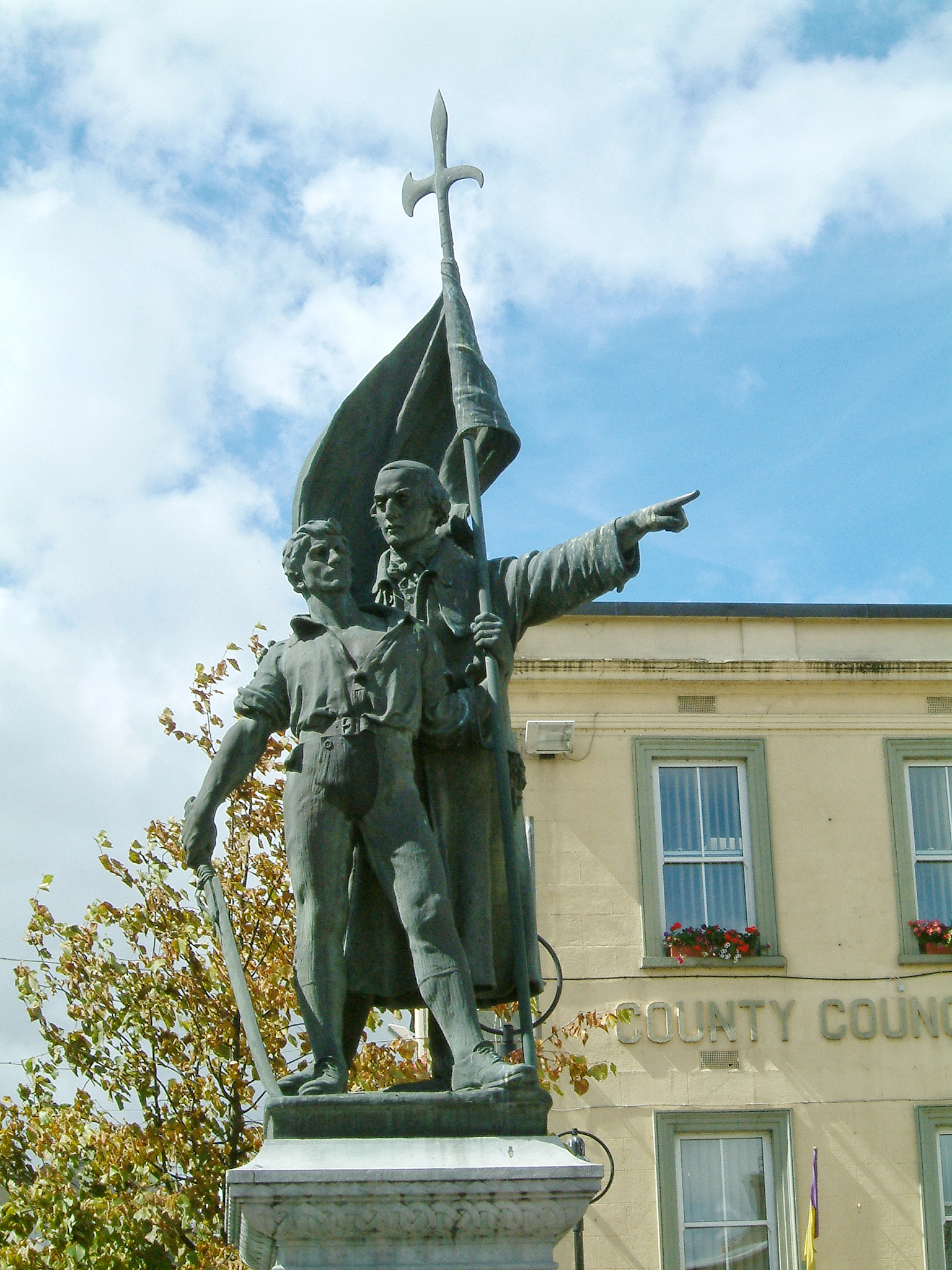 The famous statue in the market square of Enniscorthy shows the doomed Father Murphy, a leader of the ’98, pointing the way to Vinegar Hill for a young volunteer, ‘The Croppy Boy’.