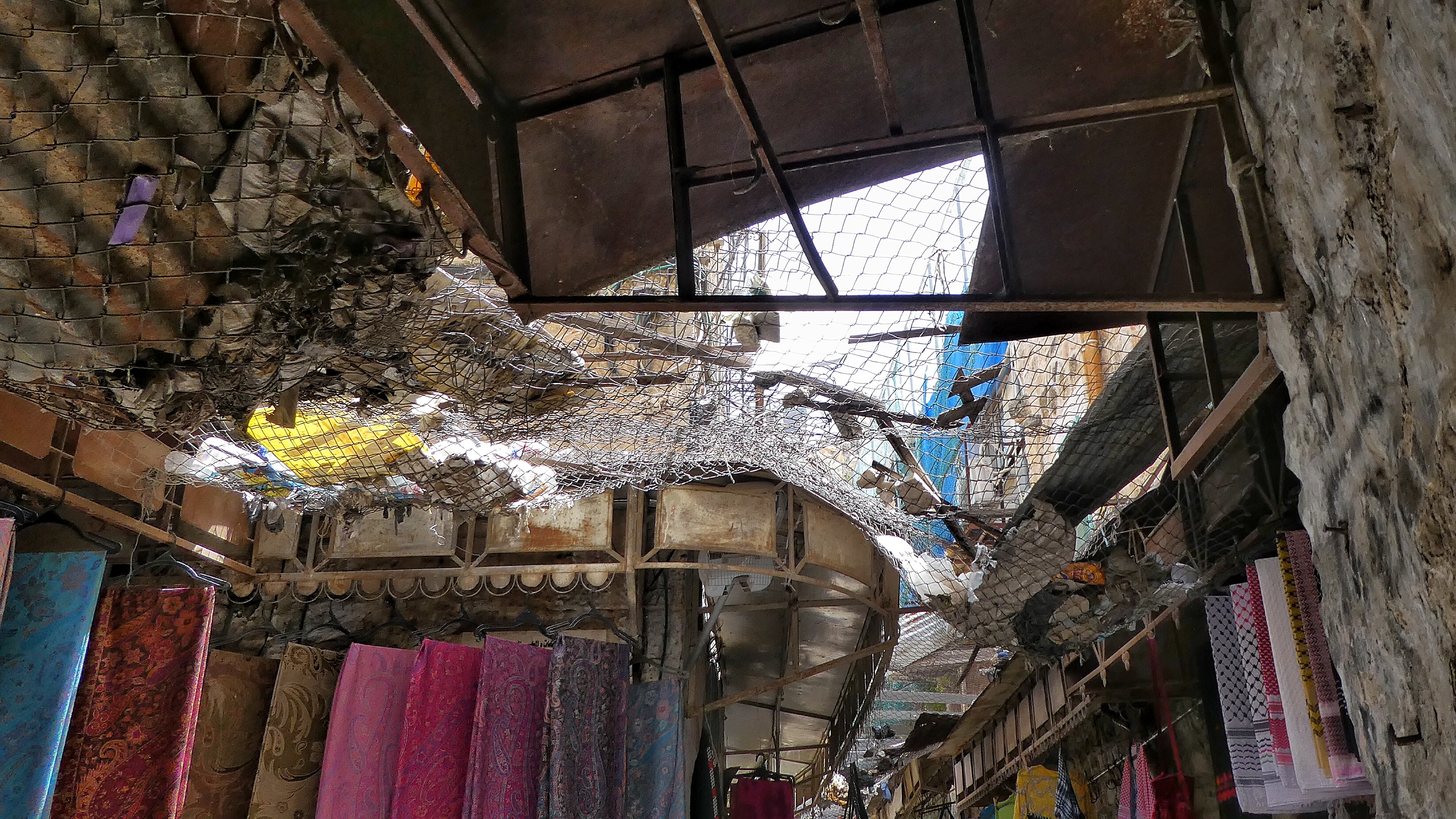 The area around the divided holy place is a ghost town. On one flank, a deserted street is patrolled by young Israeli soldiers in full battle gear, leading to the settler neighborhood. On the other side, past checkpoints and security screening, is Shuhada (martyrs) Street, an impoverished souq with more shops locked up than open, a small number of Palestinian storeowners, and a bevy of children endeavoring to sell us souvenirs. Above the few shops that are still open, there is a wire mesh to catch rocks, garbage, and various unmentionables thrown at Palestinians from Israeli settler families who have literally occupied the higher ground, abutting and overlooking the souq.