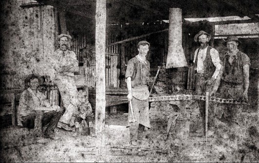 Tarkeeth quarry blacksmith shop c.1900. Charles Thompson, 2nd from left ;Daniel Thompson,5th from left. Daniel was foreman. He died in 1905 in an explosion at the quarry (Scott Thompson)