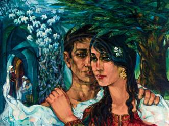 Shammout never ceased to depict the Palestinian exodus from Palestine in paintings that carried titles and meanings very much present in people’s minds and in his own experience; an example is the painting he titled Where to? (1953). His paintings were inspired by camp life (such as Memories and Fire, 1956; We Shall Return, 1954; and Bride and Groom at the Border, 1962) and called for reflection on the meaning of a nation in waiting.