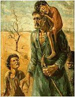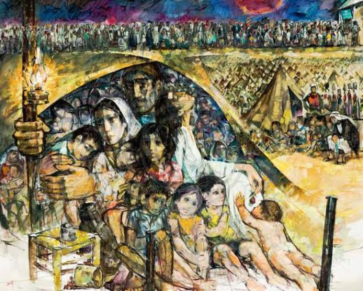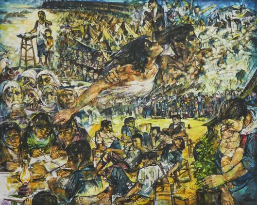 These include Shammout’s famous paintings of the Palestinians’ flight and expulsion, and the long hard road of flight on a trail of tears, the hostile sun beating down. His rendering of the heat, hunger, thirst and exhaustion recall of WH Auden’s harrowing poem The Shield of Achilles, with its contrasting and jarring snapshot images of joy and celebration and of bleak, almost monochrome desolation … “a plain without a feature, bare and brown, no blade of grass, not sign of neighbourhood; nothing to eat and nowhere to sit down, but congregated on on its blankness stood an intelligible multitude, a million eyes, a millions boots in line, without expression, waiting for a sign”.