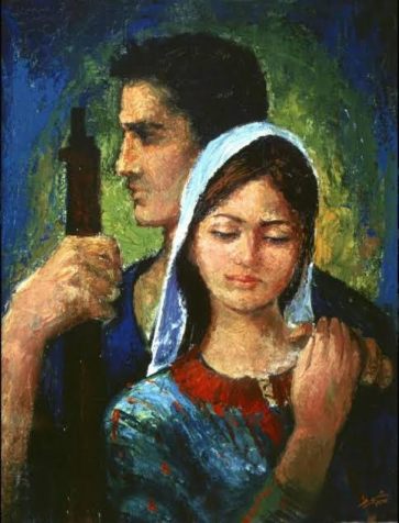 His Palestine is a timeless, almost dreamlike place quite out of time and place with its contemporary reality. Nostalgists and artists and poets of an earlier era would have described it as pastorale with its images of everyday life in the countryside, and its vignettes of young folk and old, men and women, children and babies. There are young couples in traditional costumes, young mothers with babes in arms, farmers in fields, and family groups of many generations. They are in lounges and kitchens, in yards and gardens, fields and orchards, and street markets as buyers and sellers. There are musicians and singers and dancers in myriad social settings – at parties and celebrations, marriages and festivals, parades and and processions.