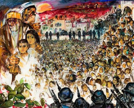 These images, the fair and the foul, reappear within larger paintings that depict the decades that followed, both the immediate – the camps and the scattering – and the contemporary – the occupation, the two Intifadat, ongoing resistance, and the perpetually stuttering peace process. In the background are the symbols and icons of Palestine past and present – particularly of al Quds, Jerusalem the golden, with the holy places that are so precious to many faiths – its mosques and churches, its monasteries and madrasas, including the Haram al Sharif and the Church of the Holy Sepulcher.