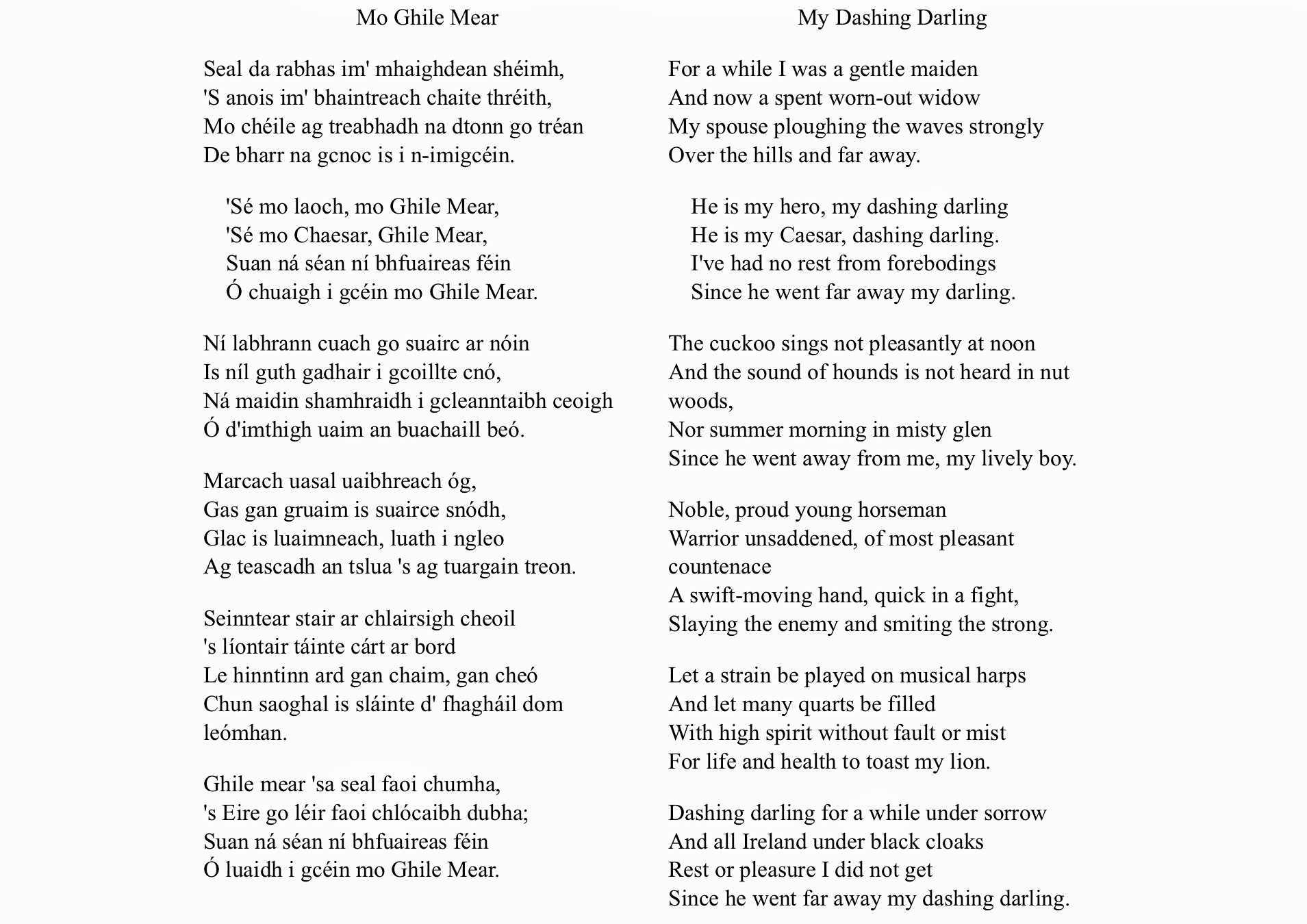 And yet, the songs live on to this day, most notably in The Skye Boat Song, Mo Gile Mear, Will Ye No Come Back Again. The old and well-recorded favourite Óró sé do bheatha ‘bhaile has also been associated with the Jacobite cause as Séarlas Óg (“Young Charles” in Gaelic). The poet Padraig Pearse, leader of the doomed intifada we know as the Easter Rising of 1916, added new verses, and so the song entered the rebel canon.